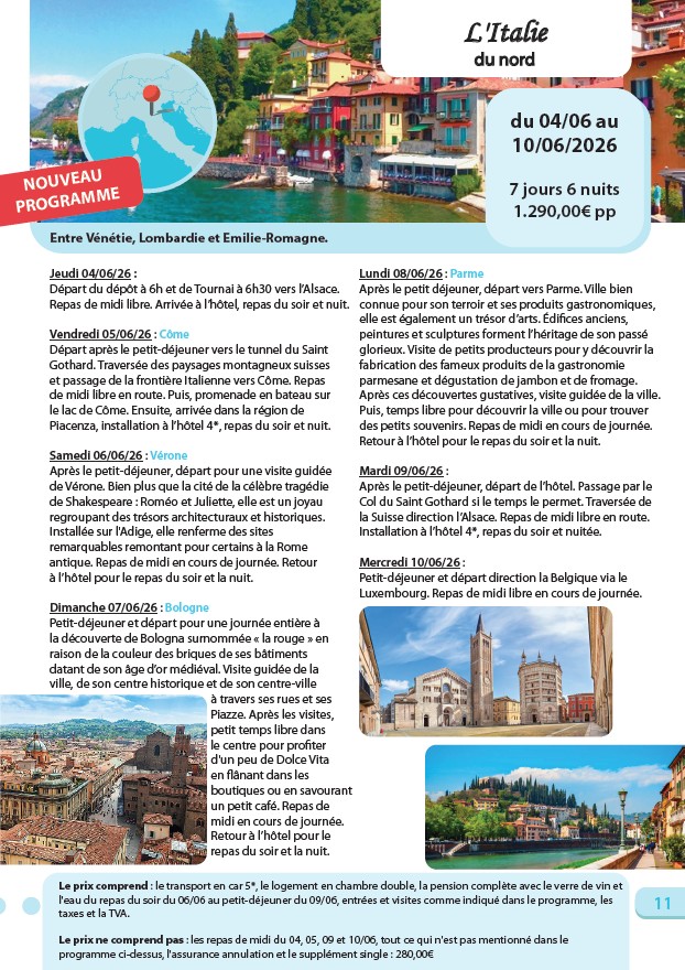 Programme détaillé : https://www.voyages-suncars.be/wp-content/uploads/2025/11/11.Italie.jpg