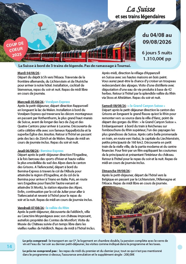 Programme détaillé : https://www.voyages-suncars.be/wp-content/uploads/2025/11/14.Suisse.jpg