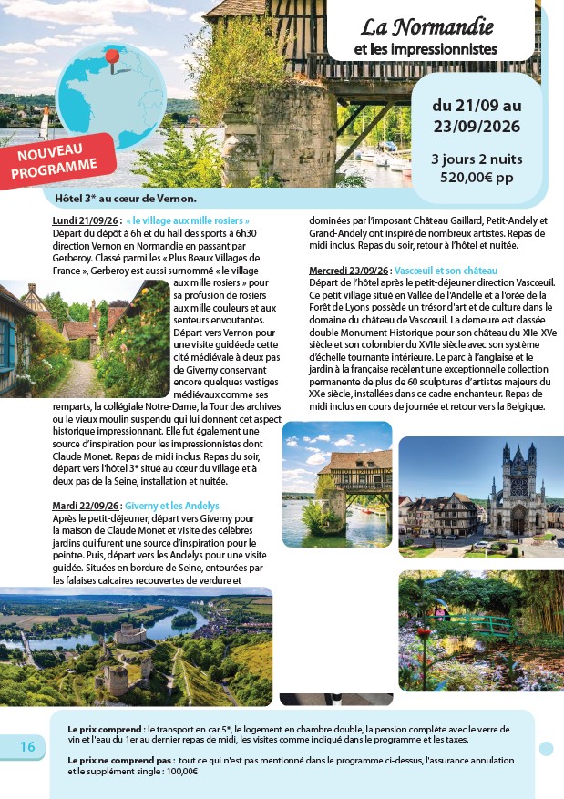 Programme détaillé : https://www.voyages-suncars.be/wp-content/uploads/2025/11/16.Normandie.jpg