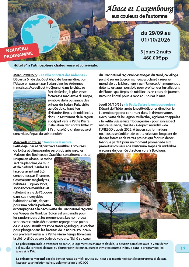 Programme détaillé : https://www.voyages-suncars.be/wp-content/uploads/2025/11/17.Alsace-et-Luxembourg.jpg