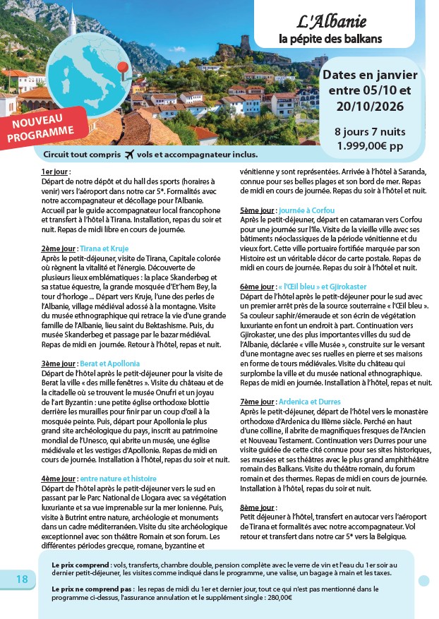 Programme détaillé : https://www.voyages-suncars.be/wp-content/uploads/2025/11/18.Albanie.jpg