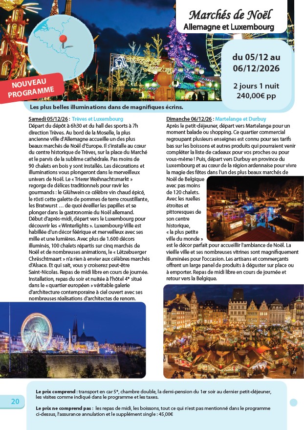 Programme détaillé : https://www.voyages-suncars.be/wp-content/uploads/2025/11/20.Marches-Noel.jpg